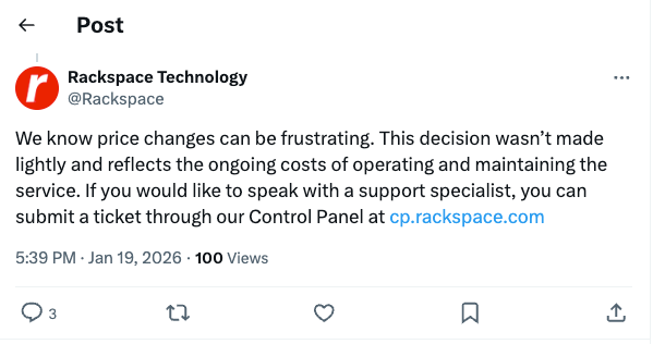 Rackspace's response on X: "We know price changes can be frustrating."